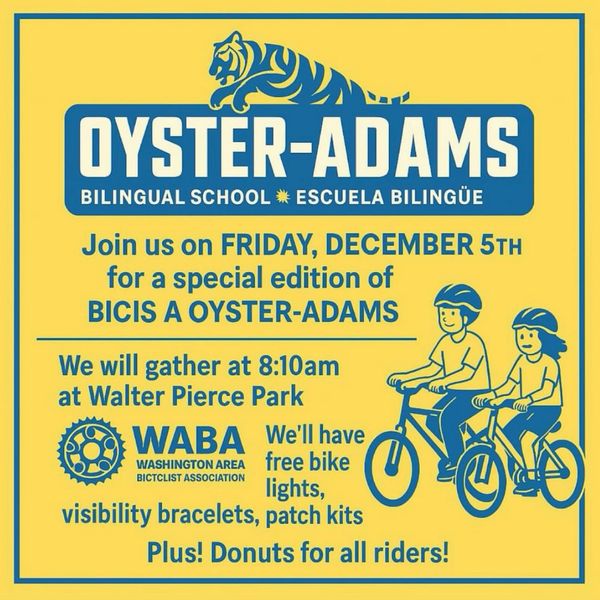 Join us on Friday, December 5th for a special edition of Bicis a Oyster-Adams. We will gather at 8:10am at Walter Pierce Park, joined by Seth Grimes, Washington Area Bicycle Association’s DC Organizer. Seth will hand out bike lights, visibility bracelets, and patch kits. We will also distribute donuts to participants. 🍩🚴🏻♀️🚴🏽🍩