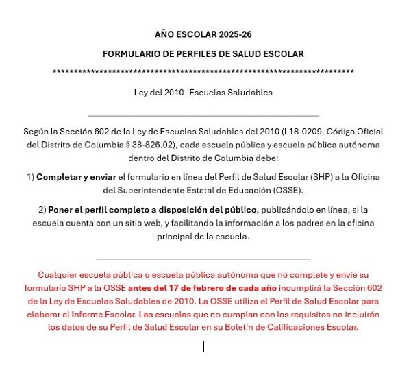 Nos gustaría compartir información importante sobre la Ley de  Escuelas Saludables del 2010  y cómo apoya la salud y el bienestar de nuestros estudiantes. Como parte de esta ley, nuestra escuela completa un Perfil de Salud Escolar cada año para proporcionar actualizaciones sobre nuestros programas de salud, servicios y entorno.