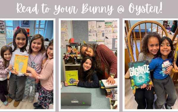 Celebramos a Tighe Grogan (alumna de 5to grado en el centro) que pasó el día en la biblioteca de Oyster practicando para su futuro sueño como bibliotecaria escolar, rodeada de fotos de las experiencias de "Lee a mi Conejito" donde hermanos mayores o amigos leen a la clase de su hermano o hermana menor. ¡Gracias a Sol y Ashley por leer a sus conejitos!